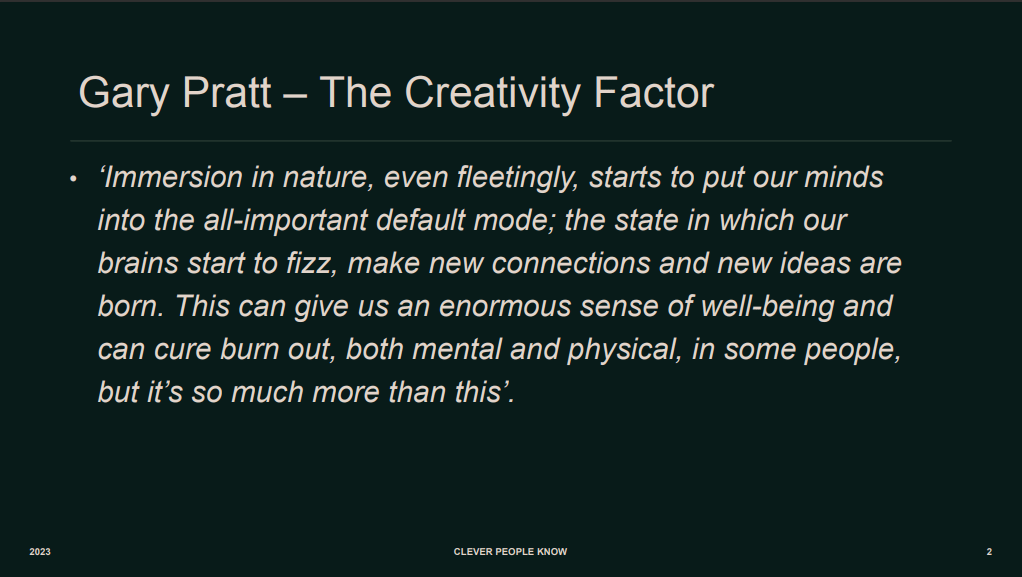 Being outside in nature is categorically proven to enhance wellbeing and creative thinking. In Garry Pratts book, ‘The Creativity Factor’, he cites evidence to suggest that spending quality time in nature increases creativity by a factor of 46%, therefore getting outside seems to be a ‘no Brainer’!