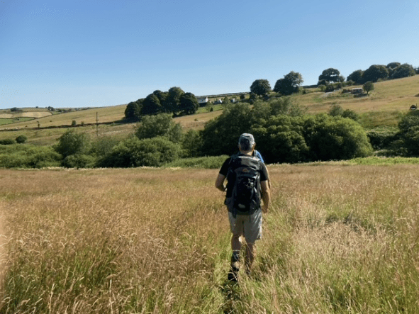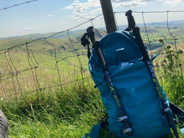 River crossing sorted we crossed the minor road and headed on to Moorside and onwards to our first break on Hollins hill, by which time the sun was ‘scorchio’. I’m not too sure how effective the sunscreen was up to now as the sweat was dripping off my head and inside my sunglasses (fine image)!!