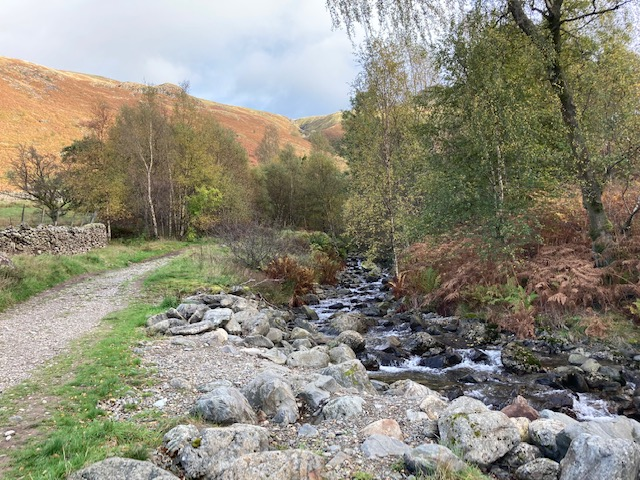 We exited the accommodation, after several quick pictures and dropped out of the back of the venue which is conveniently situated right on the bank of Thirlmere. After less than a kilometre we were at the underpass on the A591 where we could see the vast bulk of Helvellyn off to our right.