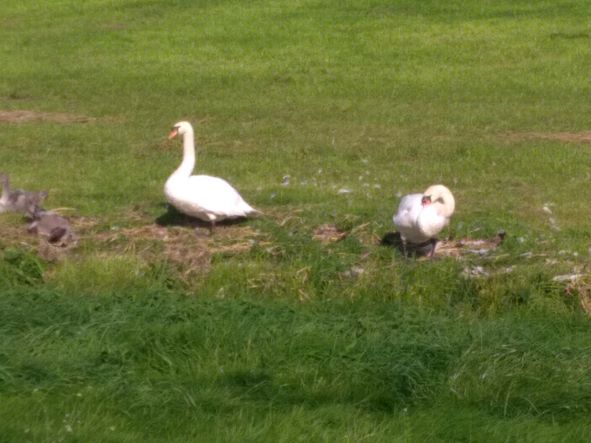 I was back on my route along the river and walked along in the grass with the sun on my back and it was starting to get hot. The birds were everywhere and next to me in the small water ways, I saw two swans with the young one their nest and that really made me smile. I past the little Ferry bring cars, motorbikes and groups of racing bikers ready for their sunday outings.