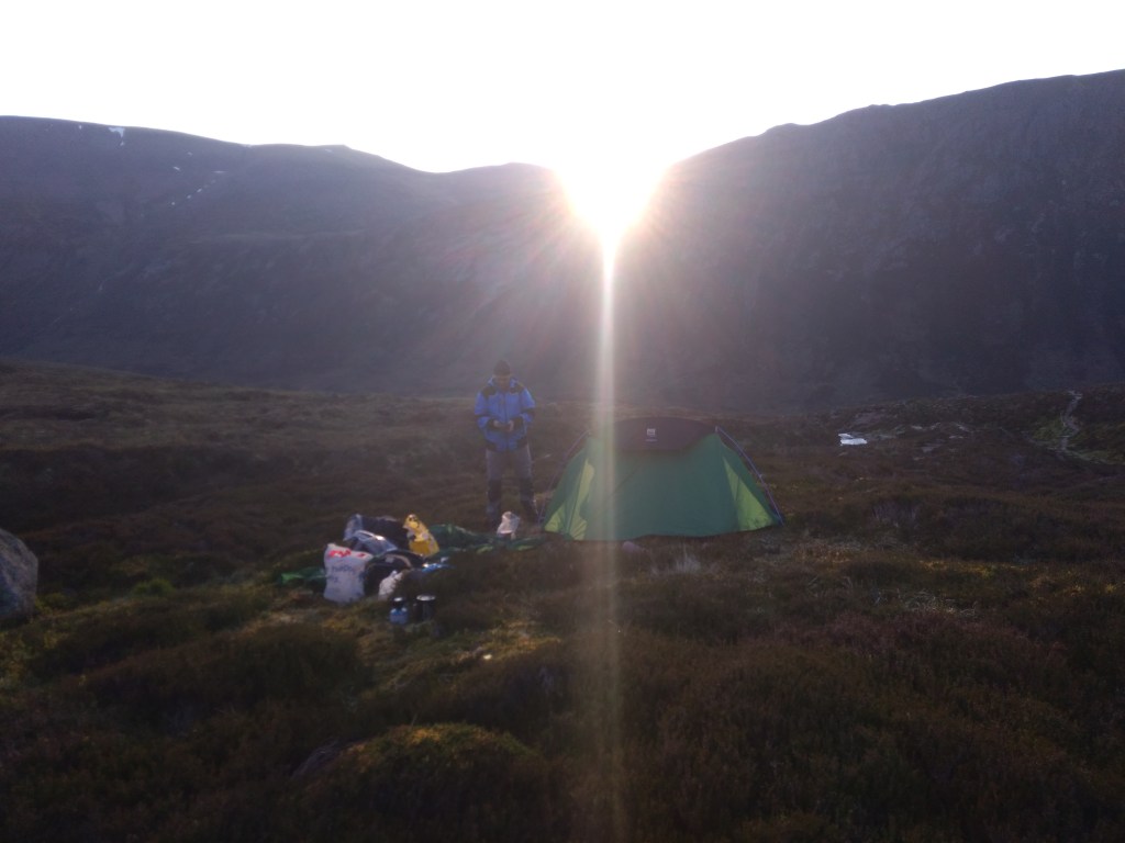 We located the bothy, which was partially occupied and a little bit dark to say the least, so we elected not to bother and pressed on to a grassy area just near to the fords at ‘Allt a Choire Odhair’, which was to be our wild camp for tonight in the shadows of ‘The Devils Point.’